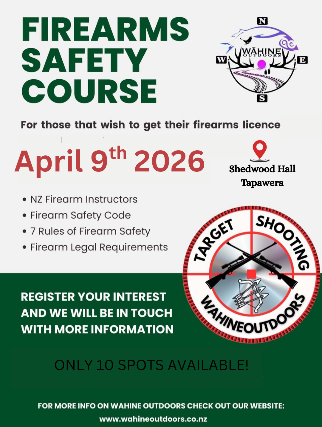 FIREARMS SAFETY COURSE This is a free course and designed for those that are wanting to apply for their firearms licence. Spaces are limited to 10 so get in quick!